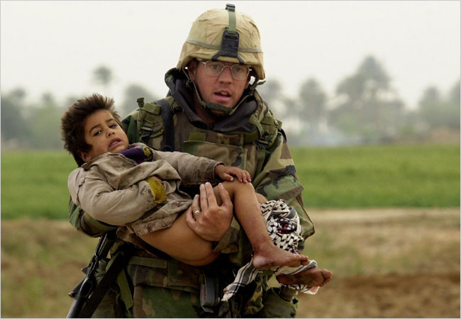 The photo below captures everything that Americans wanted to believe about the Iraq war in the earliest days of the invasion in 2003. Pfc. Joseph Dwyer, an Army medic whose unit was fighting its way up the Euphrates to Baghdad, cradles a wounded boy. The child is half-naked and helpless, but trusting. Private Dwyer’s face is strained but calm.