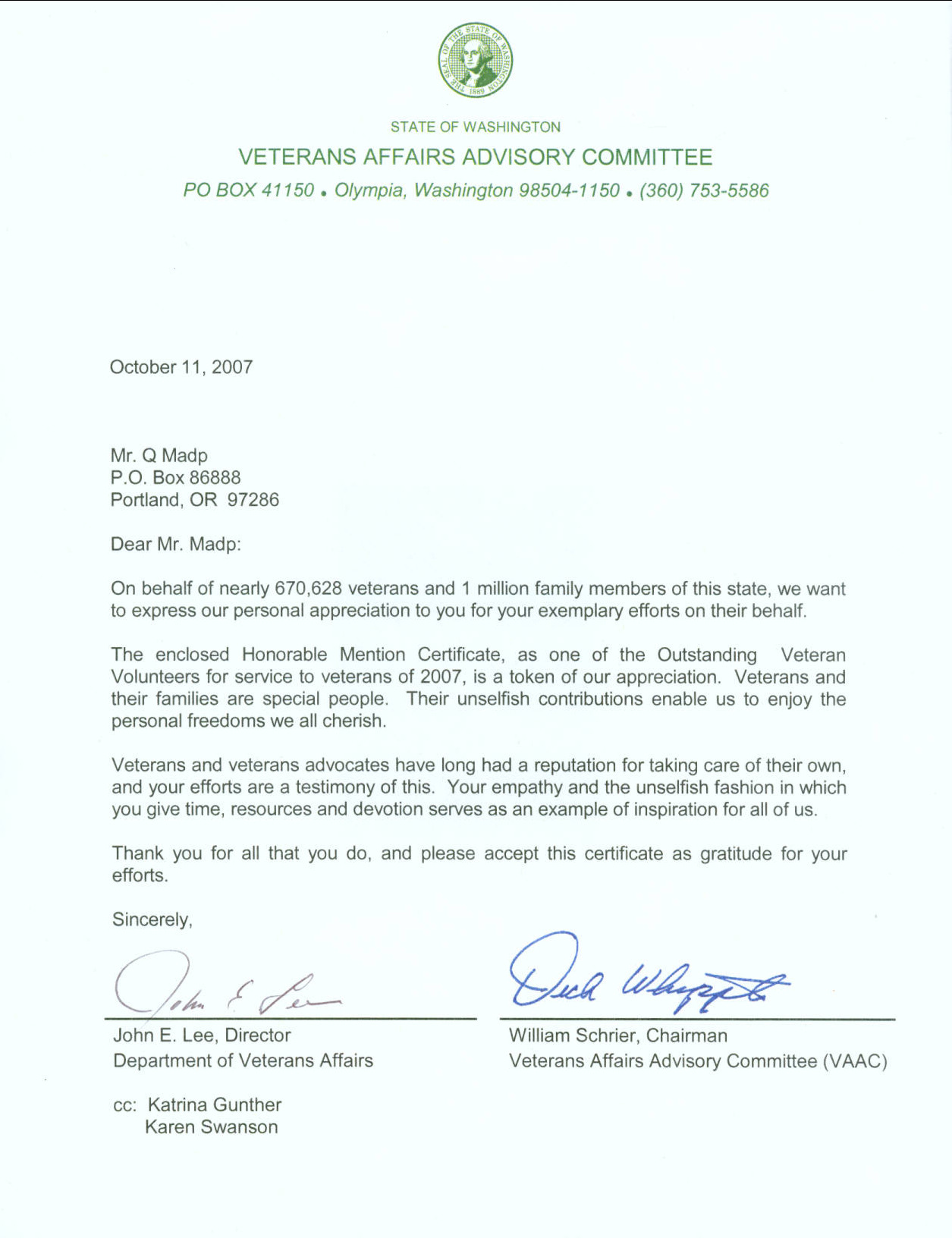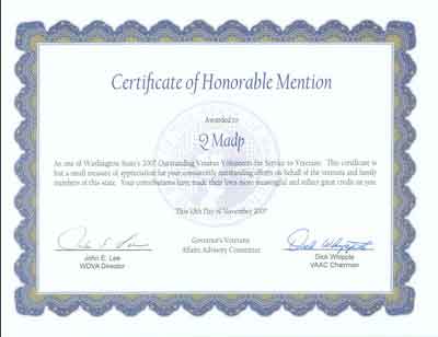 I would like to Thank everyone that submitted my name for veteran volunteer. It was even more of an honor having received it today (Monday Oct 22, 2007) on the same day, and almost same time, that one of our great heroes Lt. Murphy received the Medal of Honor.